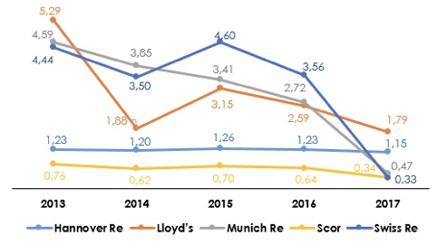 On y voit comment la politique de Hannover Re (encore réaffirmée récemment et utilisant au mieux les capacités de rétrocession) conduit à une quasi stabilité des résultats alors que celle de SR, lloyds ou MR (aux fortes rétentions) induit une forte volatilité. La politique de rétrocession n’est pas l’unique élément en cause, mais on peut soupçonner qu’elle joue un rôle non négligeable.